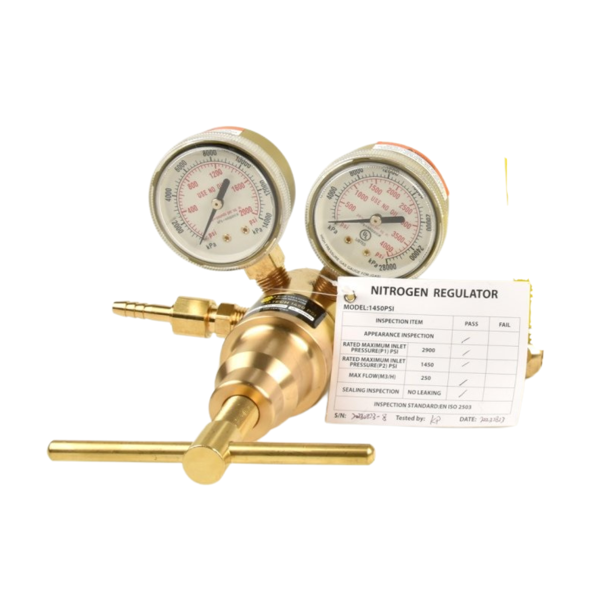 การใช้ในโตรเจนหารอยรั่วของเครื่องปรับอากาศหรือแอร์ ควรมีเกจ์ปรับแรงดันเพื่อปรับแรงดันให้เหมาะสมกับอุปกรณ์และน้ำยาที่เลือกใช้ เพราะอุปกรณ์และน้ำยาบางชนิดรองรับแรงดันน้ำยาได้ต่างกัน ตัวอย่างเช่น น้ำยา R22 สามารถรับแรงดันได้ 404 PSI น้ำยา R32/401A สามารถรับแรงดันได้ 680 PSI ดังนั้นจึงต้องมี การใช้เกจ์ปรับแรงดัน เพื่อปรับแรงดันให้เหมาะกับการตรวจสอบ เพื่อไม่ให้เกิดการเสียหายต่ออุปกรณ์และไม่ทำให้คอมเฟสเซอร์เกิดการระเบิดเนื่องจากแรงดันมากเกินไป ในตัวถังไนโตรเจนจะมีแรงดันประมาณ 2,000-2,500 PSI ซึ่งมีแรงดันสูงกว่าที่เครื่องปรับอากาศรับได้ ดังนั้นการใช้ถังไนโตรเจน ต้องใช้เกจ์ปรับแรงดันควบคู่กัน เพื่อลดการเกิดอุบัติเหตุ จึงอยากแนะนำเพื่อนๆช่างแอร์ให้เลือกใช้อุปกรณ์ในการเช็ครั่ว ให้ถูกต้องและถูกวิธีตรวจเช็คความพร้อมอุปกรณ์ก่อนใช้งานทุกครั้งก่อนเริ่มใช้งาน เพื่อเพิ่มความปลอดภัยของช่างและผู้ใช้งานทุกท่าน